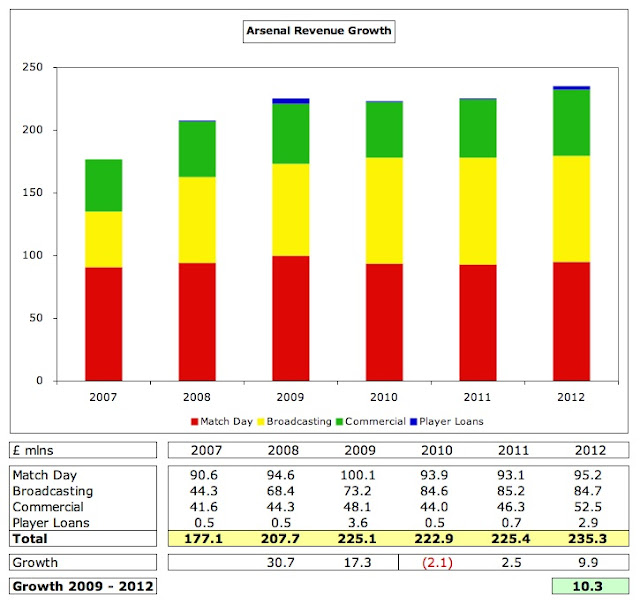 But the story is much, much better than that. Add together the 37m from future Property Sales + 11m from Player Sales Net (last season) + a front loaded Emirates deal + a front-loaded Puma deal + extra annual revenues of 50m(?) via primary sponsors + new secondary sponsors + 25m(?) new extra broadcast revenue.)